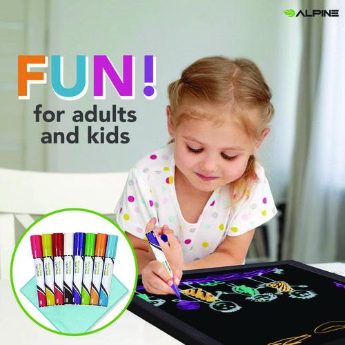 The Alpine Industries LED Illuminated Hanging Message Writing Board features a glowing neon notice sign with 48 different flashing display styles. With a main panel made of high-quality tempered glass fitted in a durable aluminum frame, this LED writ- Can be used vertically or horizontally with hanging chain.