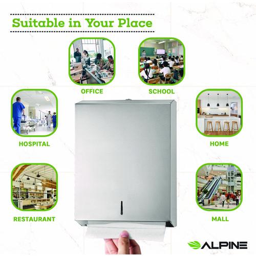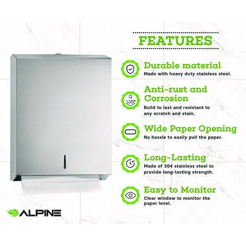 The Alpine Industries C-Fold/Multi-Fold Paper Towel Dispenser is a high-capacity dispenser that's efficiently designed to dispense one towel at a time. Perfect for heavy use, it accommodates up to 400 C-Fold or 525 Multi-Fold towels. Expertly crafted- Furnished in stainless steel, it's the perfect accessory for office breakrooms, food service facilities, schools, healthcare facilities and more.
