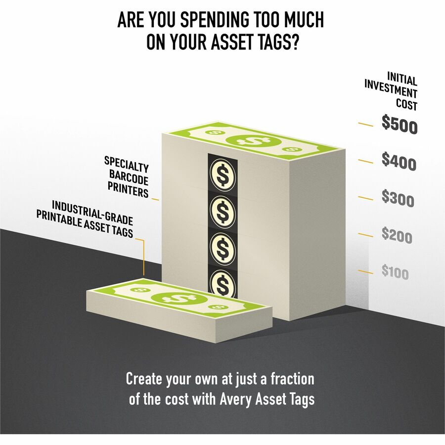 PermaTrack Metallic Asset Tag Labels make it easy to create your own heavy-duty, metallic asset tags; bar-code labels; equipment tags; property tags and nameplates on demand, right from your laser printer. Accurately record and monitor valuable assets such as electronics, equipment, tools, furniture and containers. Labels feature a strong adhesive and durable metallic material that is chemical-resistant, waterproof and abrasion-resistant. Customize with text, graphics, serialized numbers and bar codes using the free, online, Avery Design & Print software with bar-code generator. Print as many asset tags as you need when you need them - avoiding high minimum order quantities and long lead times from custom printing services. Labels are optimized for superior print performance to print smoothly without skewing or jamming.