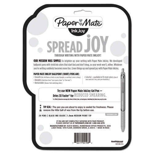Spread joy with InkJoy and brighten up every page with ink that flows as freely as your thoughts. Paper Mate® InkJoy 100 RT Retractable Ballpoint Pens feature a smooth, fast-starting writing system that spreads ink easily, so writing's never a drag.