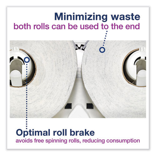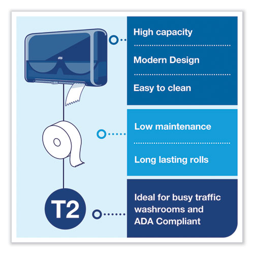 The Tork® Elevation® Bath Tissue Mini-Jumbo Roll Twin Dispenser is ideal for high-traffic washrooms where the guest experience is as important as high efficiency and low running cost. It ensures that tissue is always available by holding two full h