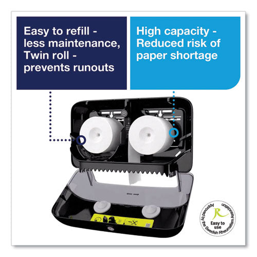 The Tork® Elevation® Coreless High Capacity Bath Tissue Dispenser is ideal for medium to high-traffic washrooms with high focus on guest satisfaction. Efficient dispenser ensures that toilet paper will always be available for guests by holding up t