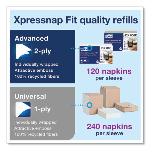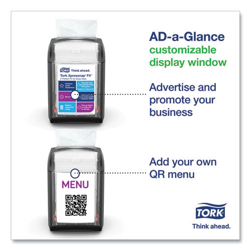 The Tork Xpressnap Fit® Tabletop Napkin Dispenser in Signature Design is our most compact dispenser napkin system yet, designed to reduce refill time and free up space in crowded restaurants. Fewer refills and less cleaning means more time for you t